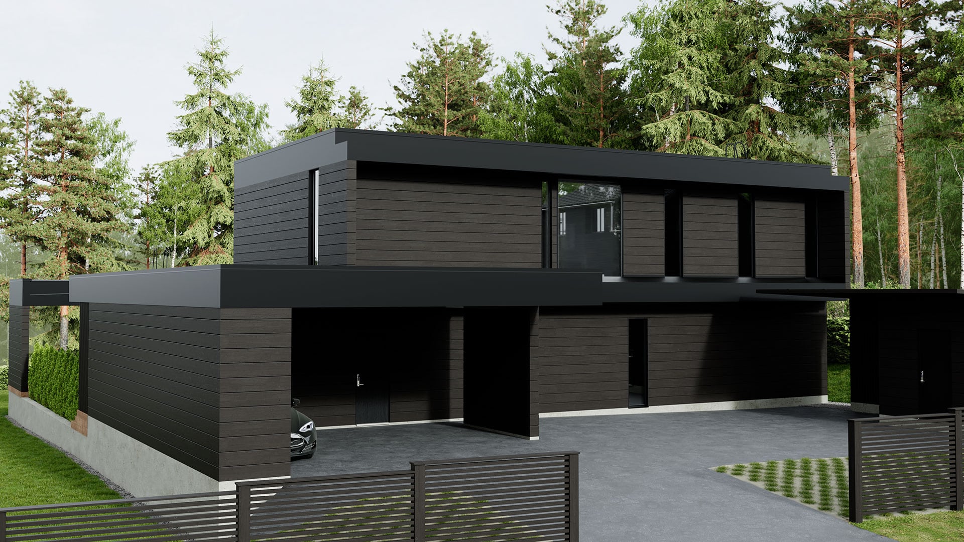 Talo on ulkomuodoltaan näyttävä ja moderni, eikä sitä välttämättä heti tunnista hirsitaloksi valtavien lasiseinien vuoksi. Tummanpuhuva laatikkomainen arkkitehtuuri ja tasakattoa imitoiva paksu yläpohjan muoto antavat rakennukselle dramaattisen komean ulkonäön.