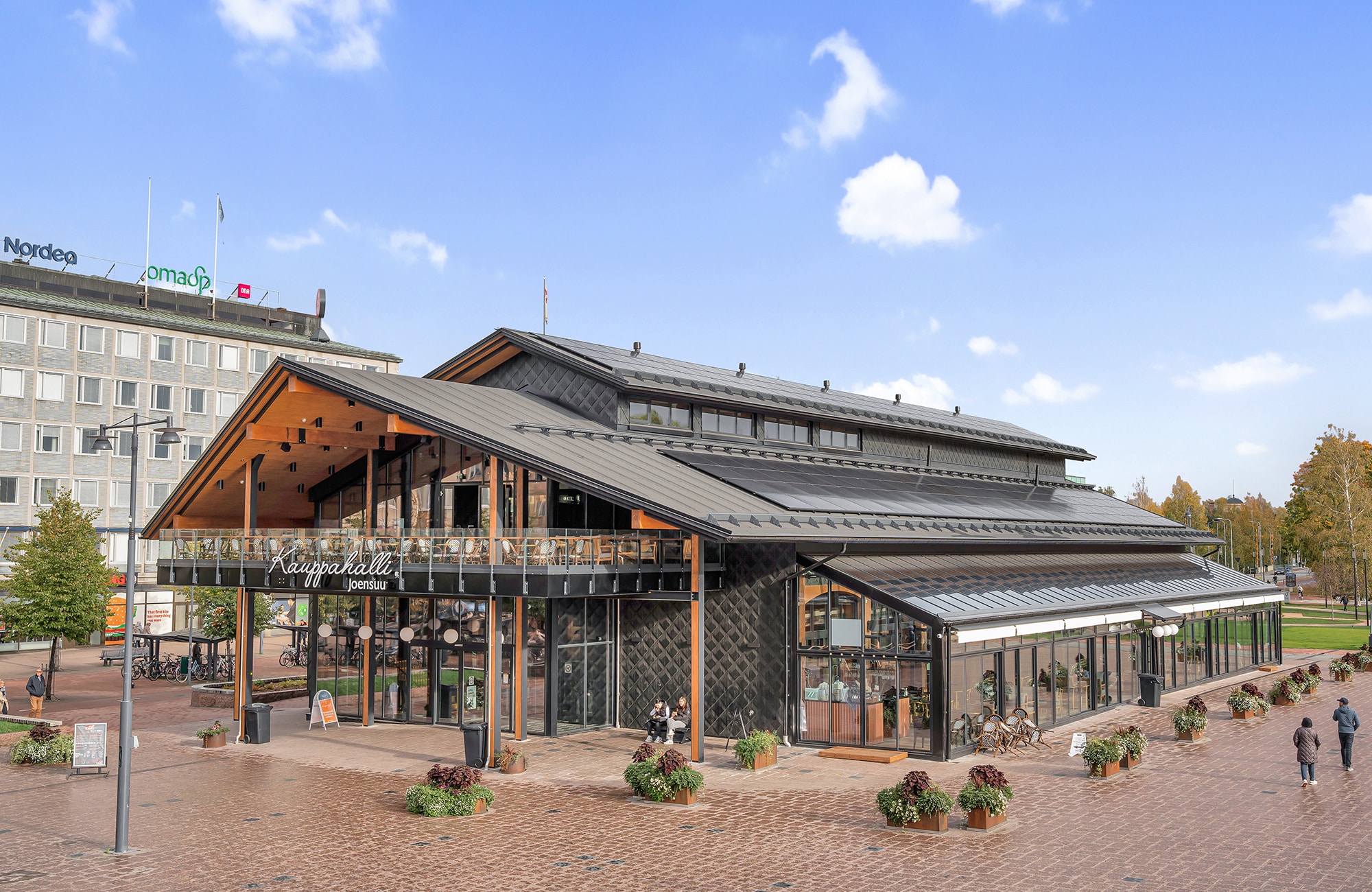 Katepalin bitumikermit viimeistelevät Joensuun Kauppahallin tuulettuvan vesikattorakenteen.
