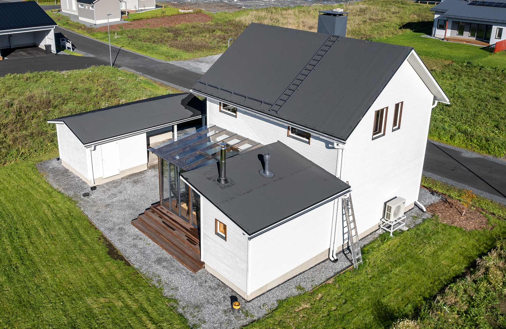 ”Normaalissa talossa on kaksi kohtaa, jotka nostavat talon päästöjä merkittävästi: betonialapohja ja peltikate. Tämän vuoksi tähän taloon valittiin puukuitueristeinen alapohja ja bitumihuopakate. Katepalin Top Tite 3° Green -tuotteella jo entuudestaan ekologisen bitumikatteen päästöjä saatiin vieläkin alemmas”, arkkitehti Horelli myhäilee.