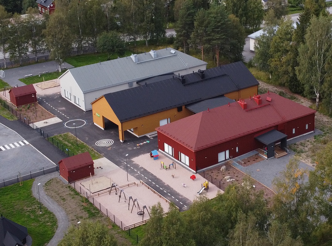 Kolme eri kattoväriä tekee päiväkodista helposti tunnistettavan.