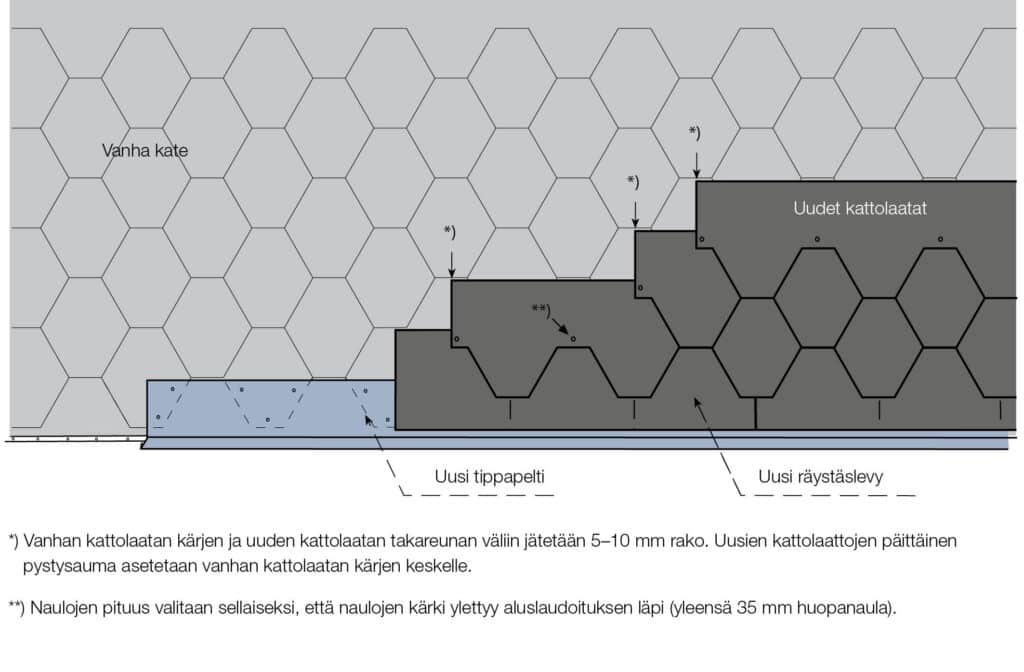 - Jätä vanhan kattolaatan kärjen ja uuden kattolaatan takareunan väliin 5–10 mm rako. Näin uuden laatan naulauskohdat osuvat vanhan laattakuvion keskelle.